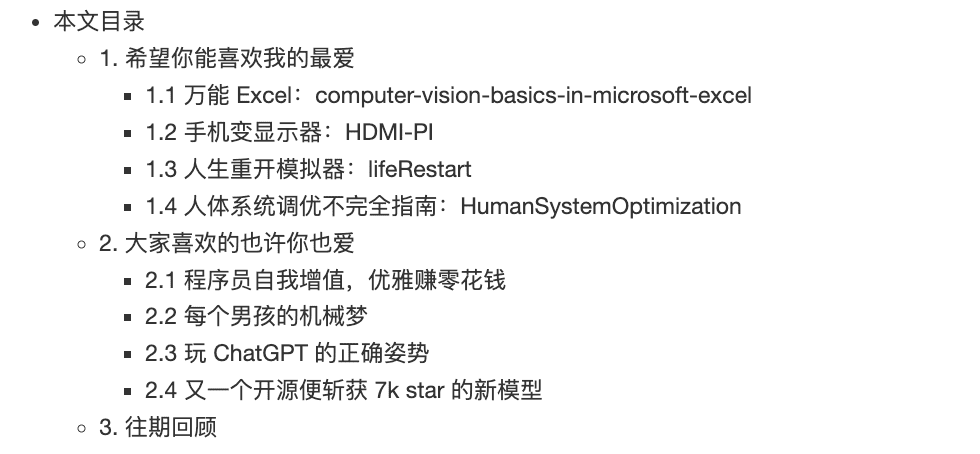 今年是 GPT 年,无论是 GitHub 还是朋友圈还是技术平台,即便你不关心 GPT 的发展情况,同大模型、AI 相关的项目总能进入你的信息流。到这期为止,热度速览也连载了四年,从一开始习惯看 GitHub Trending 找寻有意思的项目,到后来每期收录当周的热点,并每期整理一个主题相关开源项目,到去年的年末点单,再到今年的回归平常只论开源项目。这四年,热点趋势也换过名,减少过每期的介绍项目,也配合 HG 的主站增加当周的 HG 网站热门项目。而我也见证了从一开始的 500 阅读,到后来的 1,000 阅读,到现在每期的 5k 起步的阅读,越来越多的人每周一阅读上周热门的开源项目。