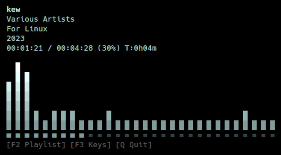 2、kew:一款 C 语言写的命令行音乐播放器。适用于 Linux 系统的命令行音乐播放器,支持搜索音乐、播放列表、专辑封面等功能。