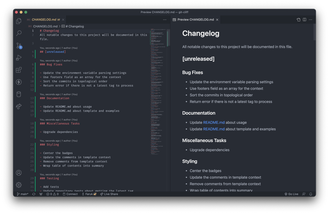 26、git-cliff:自由可定制的变更日志生成器。该项目可以自定义解析规则,自动从 Git 历史记录中生成 Changelog 文件。