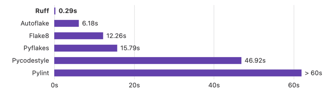 28、ruff:非常快的 Python 代码风格检查和格式化工具。该项目采用 Rust 编写,比 Python 的 Flake8 和 Black 快 10-100 倍,支持通过 pip 安装、内置 700+ 规则、兼容 Python 3.12、自动纠错等功能。