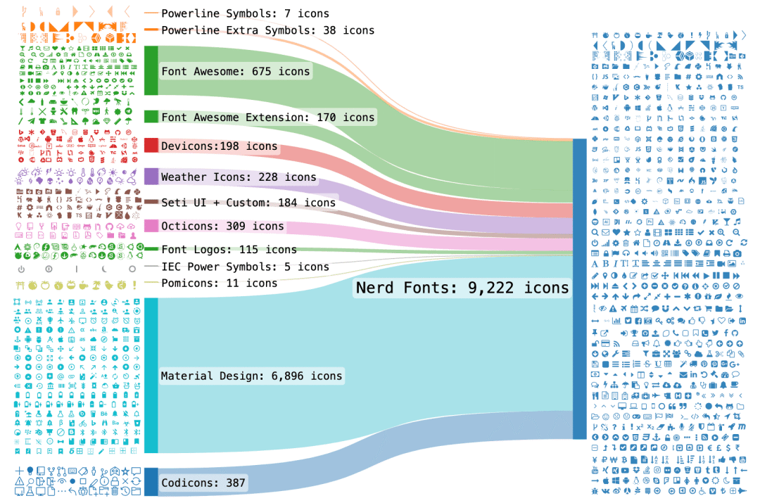 33、nerd-fonts:解决字体缺失问题的项目。这是一个收集了 3600+ 图标的字体集合和补丁工具,该项目不是一个字体,而是一个可以将多种字体中的图标,作为补丁添加到目标字体中的工具。
