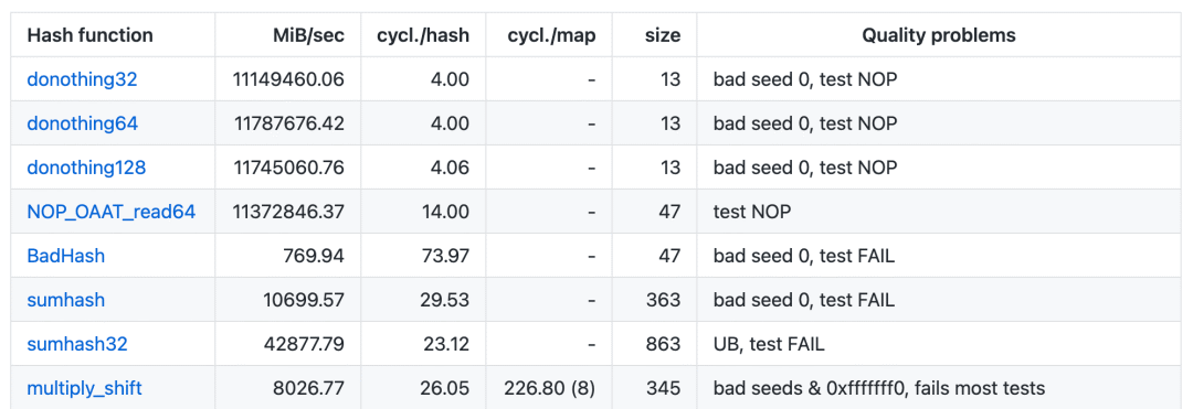 35、smhasher:测试 Hash 函数质量和速度的项目。该项目展示了 200+ 种非加密哈希函数,在分布、冲突和性能等方面的测试结果。