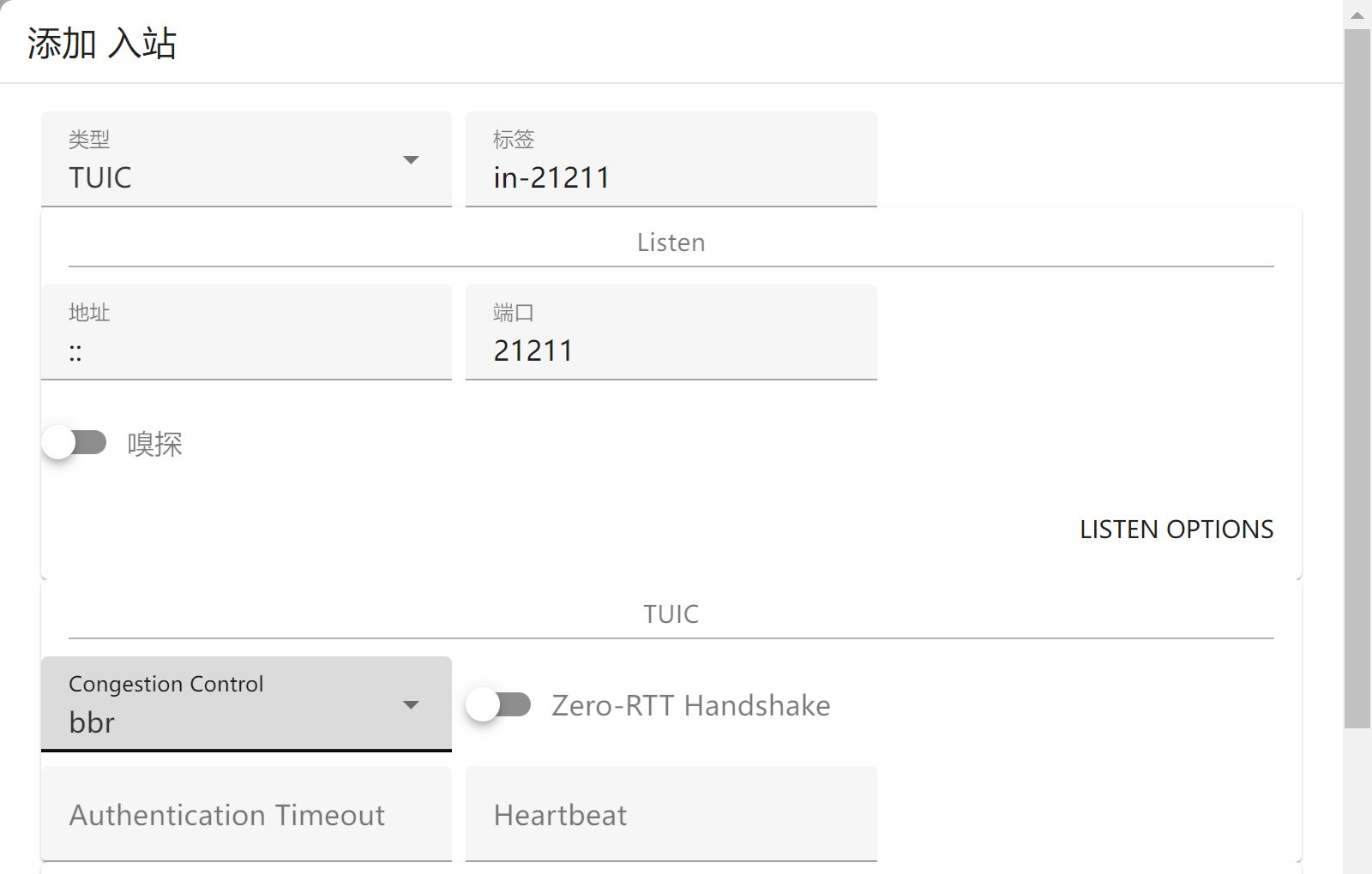 - 打开 S-UI 面板,然后添加入站节点。类型选择 Tuic V5,然后设置端口号。拥塞控制(Congestion Control)改成