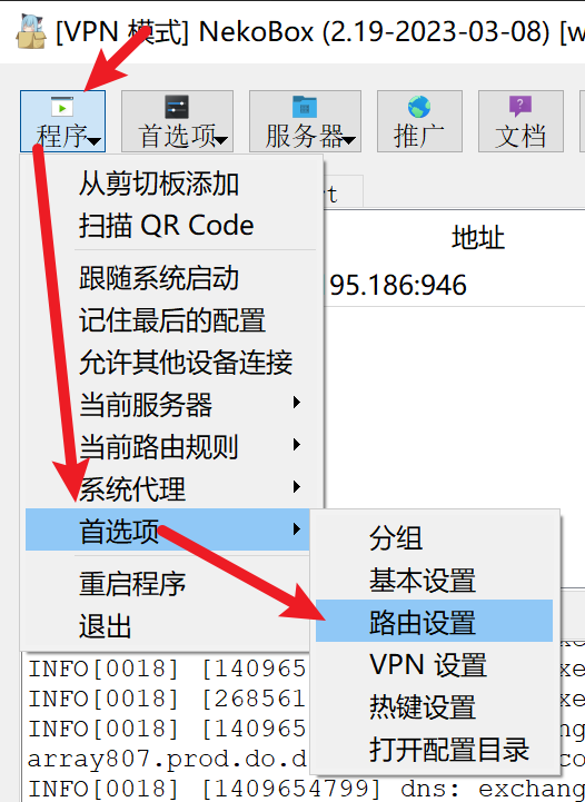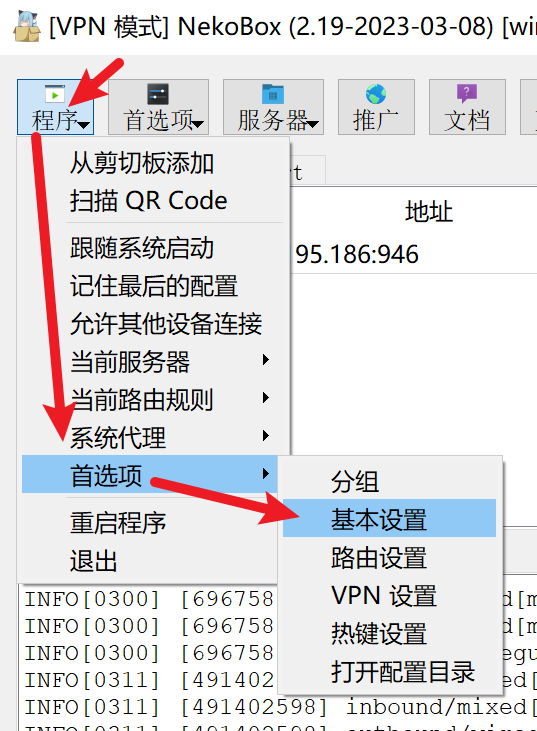 - 打开 Nekoray 客户端,依次进入 “程序”→“首选项”→“基本设置”