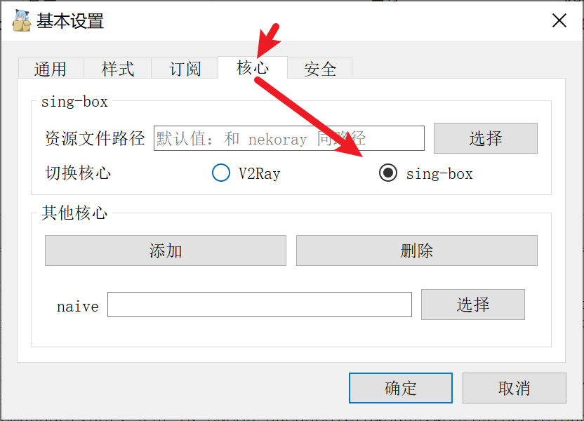 - 转到 “核心” 标签页,切换为 Sing-box 核心
