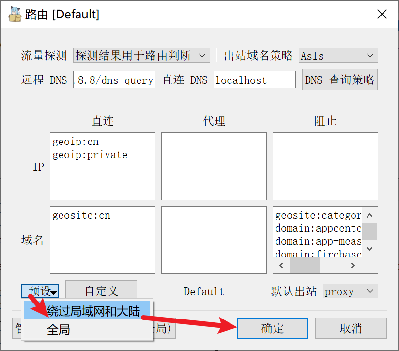 - 点击预设中的 “绕过局域网和大陆”,然后点击“确定” 保存