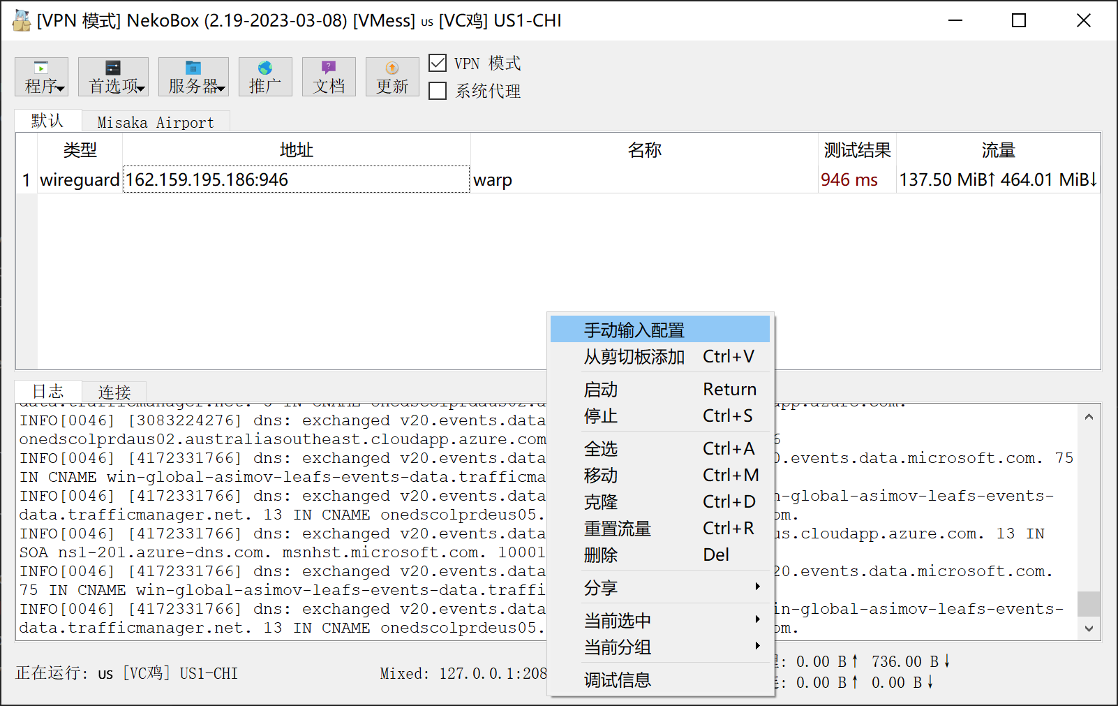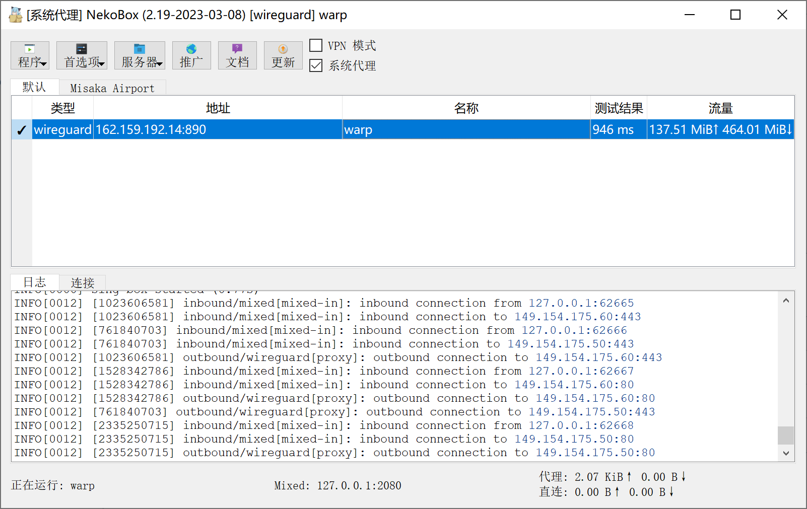 - 启用系统代理或 VPN 模式,然后选择 WARP 节点并连接。如后面有双向流量即可代表连接成功