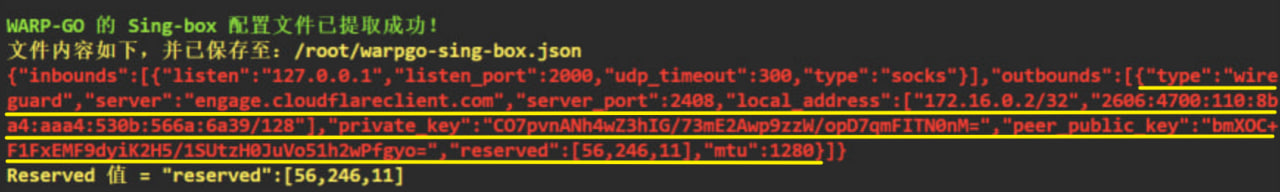 也可以使用 WARP 脚本中的 WARP-GO 提取出来的 Sing-box 配置文件(复制划黄线部分)