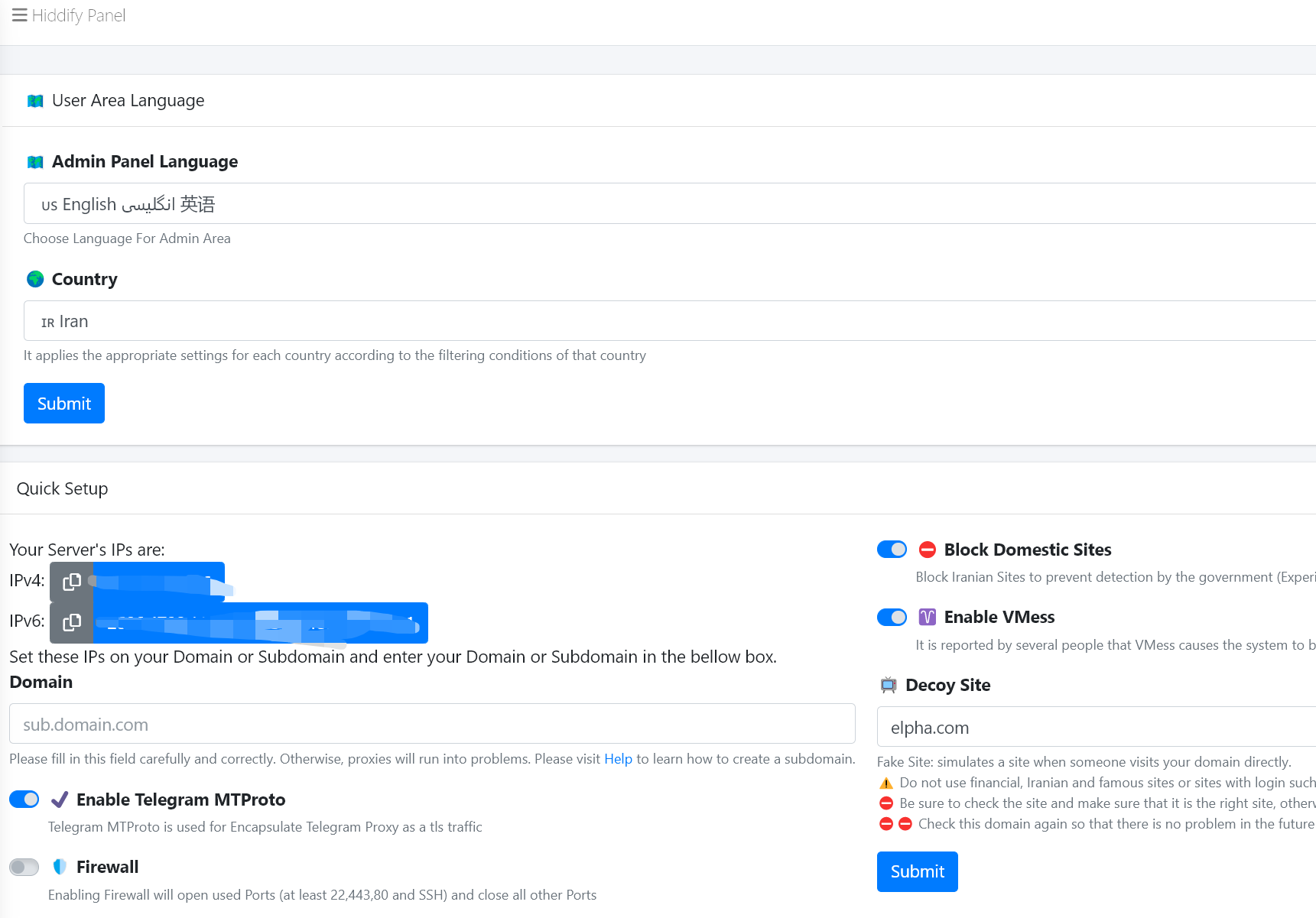 然后在 Domain 那里填写你的域名。Decoy Site 意思是伪装域名,目前默认的伪装域名可用,就不需要修改了。然后点击下方的第二个 Submit,就进入了升级界面,在这里记住你的域名,这个就是套用了域名以后的管理界面。