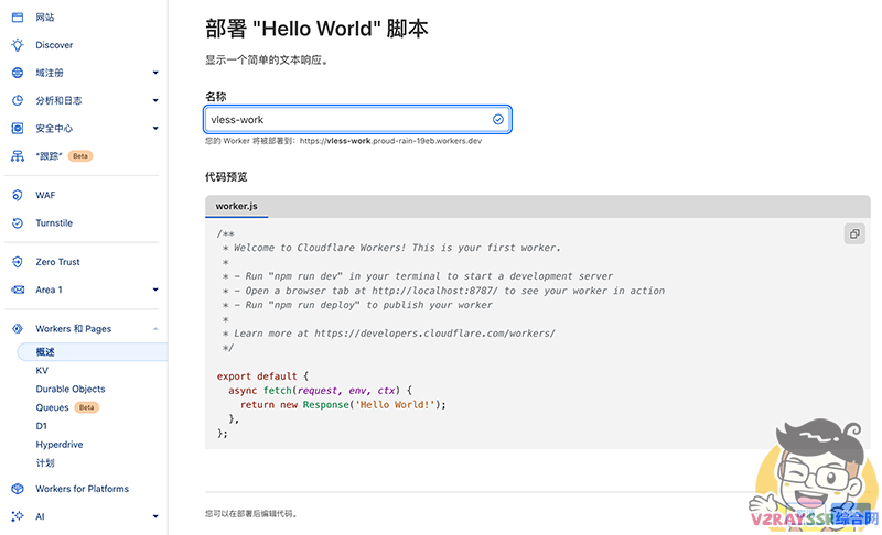来到 Cloudflare 首页,点击 Workers 和 Pages ,创建 Work ,自定义名称,然后部署!