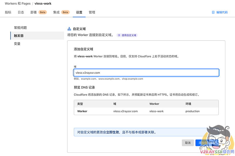 找到设置 – 触发器,添加自定义域,输入 没使用过 的 已经托管在 CF 上面 的,二级域名(xxx.xxx.xxx),如图: