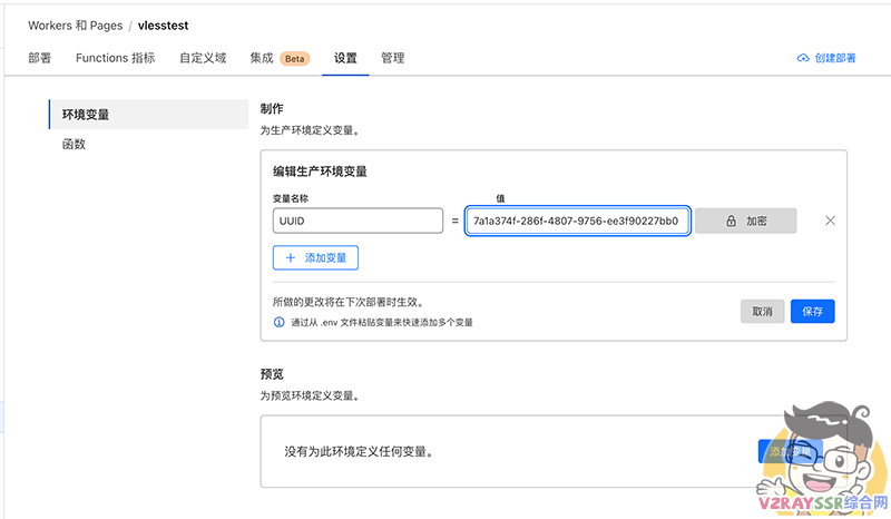 回到刚才的项目,找到设置 – 环境变量 – 添加变量,变量名称:UUID ,变量值为刚才生成的 UUID ,点击保存!