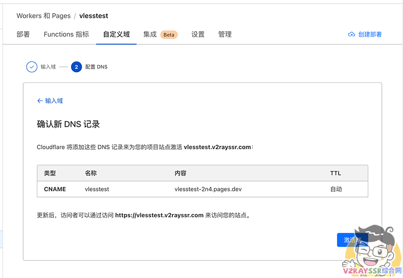若你的域名不在 CF,或是有其他免费的域名,请会域名解析平台解析如上的 CNAME 记录,若是域名已经托管到了 CF,那么请直接点击 激活域!一般情况下,几十秒就激活完成了!(后续或是需要删掉该项目,请先删除这个 自定义域)